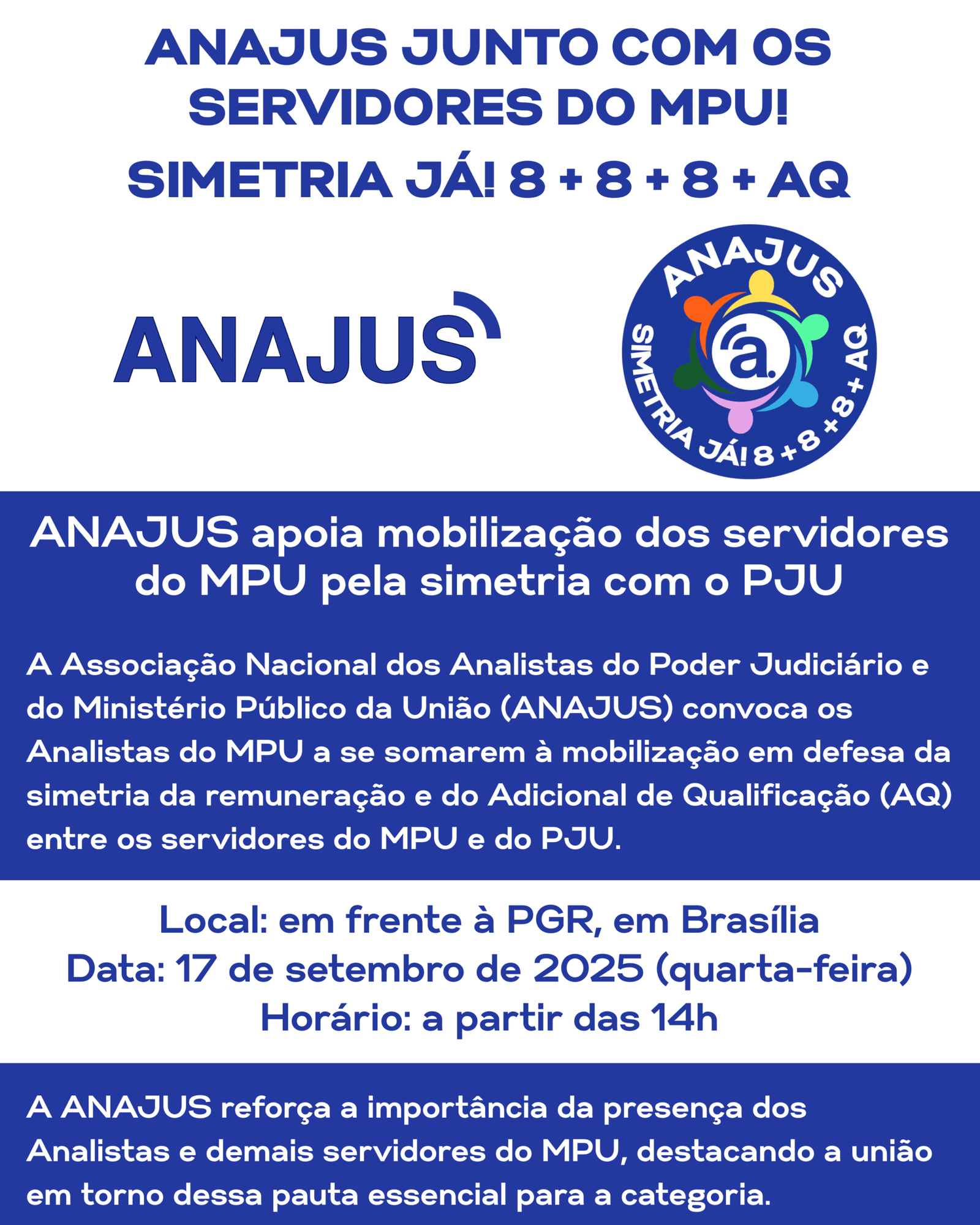 A Associação Nacional dos Analistas do Poder Judiciário e do Ministério Público da União (ANAJUS) se une aos servidores do Ministério Público da União (MPU) na mobilização em defesa da simetria da remuneração e da reestruturação do Adicional de Qualificação (AQ), em igualdade com o que já foi reconhecido para os servidores do Poder Judiciário da União (PJU).