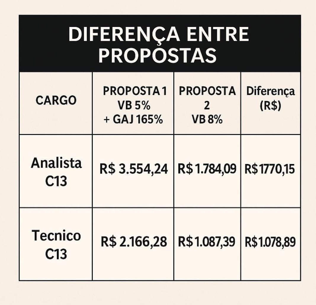 Com as abstenções, a proposta de 5% no VB com GAJ de 165% não atingiu a maioria necessária. Prevaleceu, assim, a proposta da administração de reajuste linear de 8% sobre o vencimento básico.