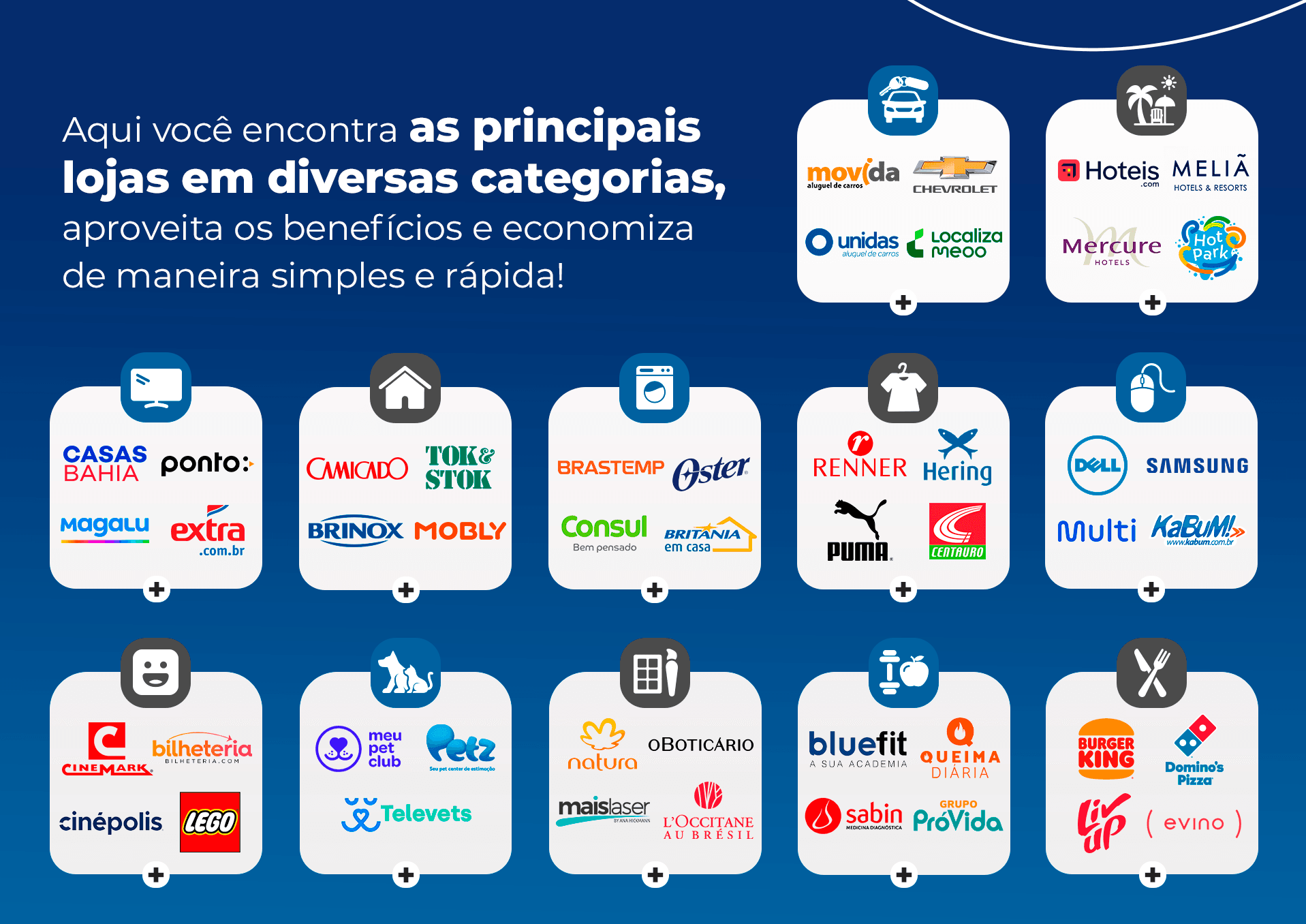 Aqui, você encontra as principais lojas em diversas categorias, aproveita os benefícios e economiza de maneira simples e rápida. Confira algumas dessas lojas: Movida, Unidas, Chevrolet, Localiza, Meliá, Mercure, Hot Park, Casas Bahia, Ponto, Magalu, Extra, Camicado, Tok&Stok, Oster, Consul, Britânia, Renner, Hering, Puma, Centauro, Dell, Samsung, Bluefit, Laboratório Sabin, Cinépolis, Evino, entre muitas outras lojas...