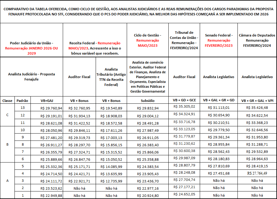 Não bastassem os sindicatos defenderem a não reposição integral da inflação acumulada, divulgam notícia falsa de que Analistas Judiciários terão remuneração equivalente à da Receita Federal e outros cargos. Veja a tabela abaixo.