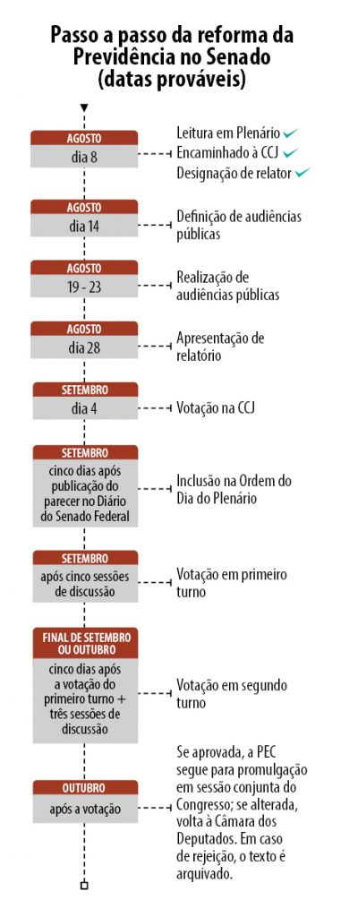 O presidente do Senado, Davi Alcolumbre, já anunciou que o calendário para a análise do texto será construído em conjunto com os líderes partidários. A reunião de líderes está marcada para esta terça (13) às 15h. Mas a presidente da CCJ, Simone Tebet (MDB-MS) e o relator na comissão, Tasso Jereissati (PSDB-CE) já anteciparam algumas datas da tramitação que permitiriam que a votação da reforma da Previdência no Senado seja concluída no final de setembro ou início de outubro, prazo já apontado por Davi como provável para conclusão da análise do texto. Pelo Regimento do Senado, a CCJ tem até 30 dias para votar um parecer — favorável ou não à proposta. O colegiado emitirá uma posição tanto em relação à constitucionalidade do texto quanto ao mérito da proposta.