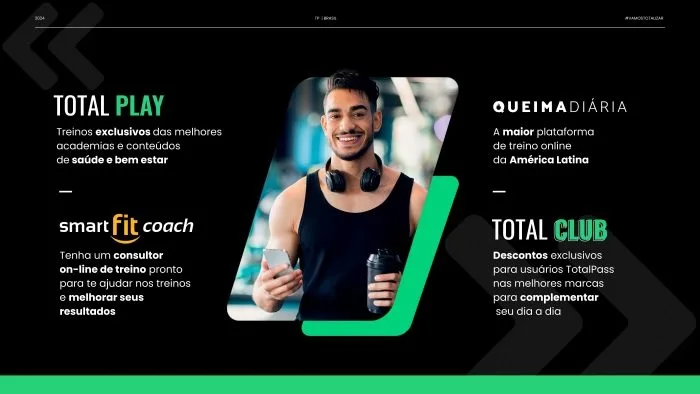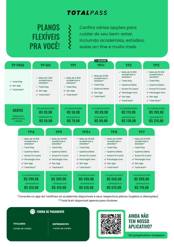 - Total Play: a plataforma da TotalPass de treinos on-line com aulas e dicas de receitas para incluir na sua alimentação;