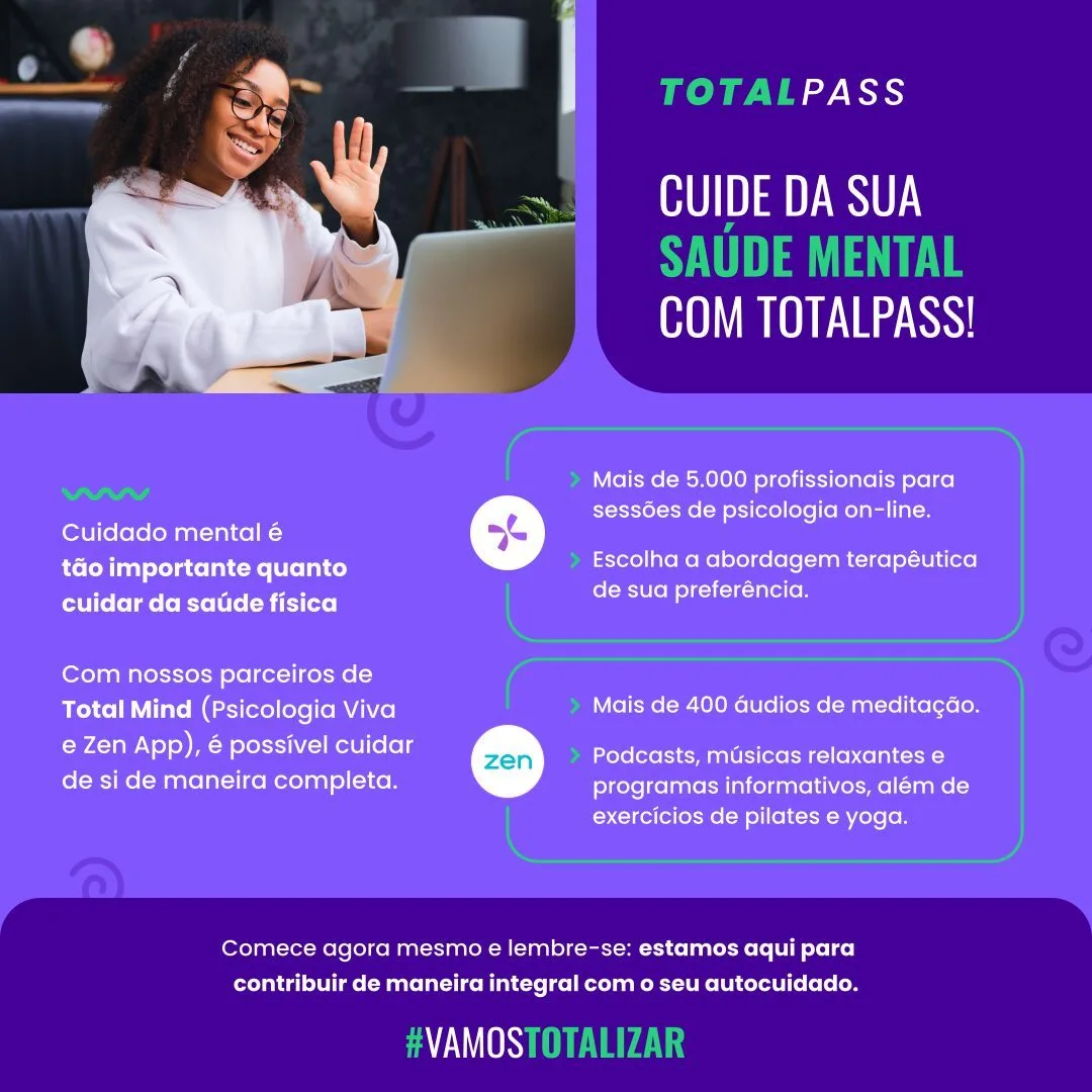 O Total Mind é o programa da TotalPass voltado para a saúde mental. Estar bem consigo mesmo envolve muito mais do que apenas a saúde física, mas, principalmente, diz respeito a termos uma saúde mental em equilíbrio. Por entender que o cuidado deve ser na saúde integral de todas as pessoas, a TotalPass lançou o Total Mind, um produto focado na saúde da mente.